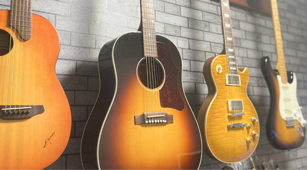 👇画像の右端がストラトキャスター、その隣がレスポール